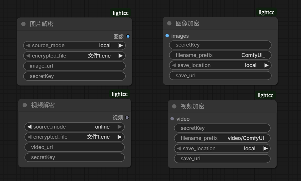 提供了一套的简单的图像与视频加解密工具节点,支持本地文件与在线资源的双向处理。所有操作均需密钥授权,并可选择将结果保存至本地或云端存储桶。