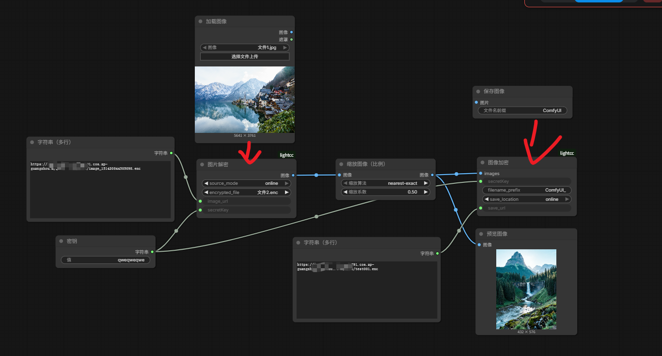💡 无需修改其他逻辑 —— 只需替换这两个节点,其余工作流(如缩放、预览等)保持不变! 工作流执行完毕将文件下载到本地,再通过加密解密软件解密和后即可查看。